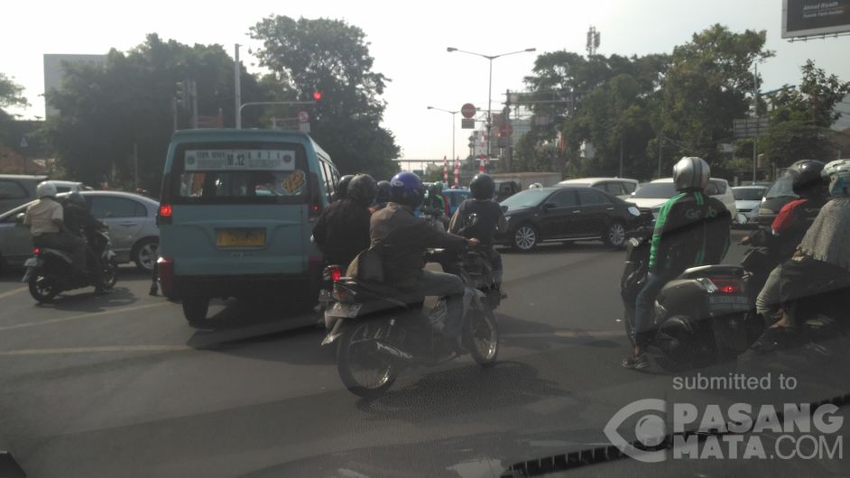 Mikrolet & sejumlah pemotor tampak menerobos batas berhenti hingga Yellow Box di TL Jl. Gunung sahari, Jakarta Pusat.