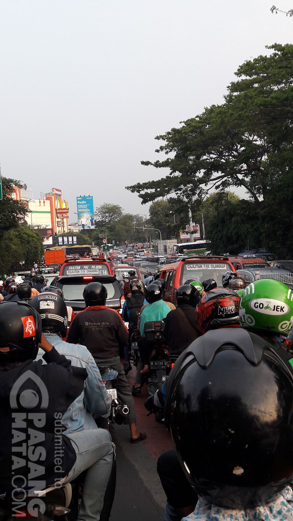 Jalan raya pondok gede macet karena arah ke pondok gede tidak gerak sehingga mempengaruhi arah jalan d persimpangan taman mini