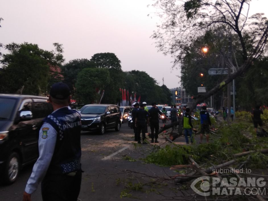 Deskripsi: Pohon tumbang di jalan Daan Mogot ruas Pintu Air Tangerang menuju Kalideres, arus lalu lintas padat, sudah dalam penanganan petugas dishub dan polisi.
