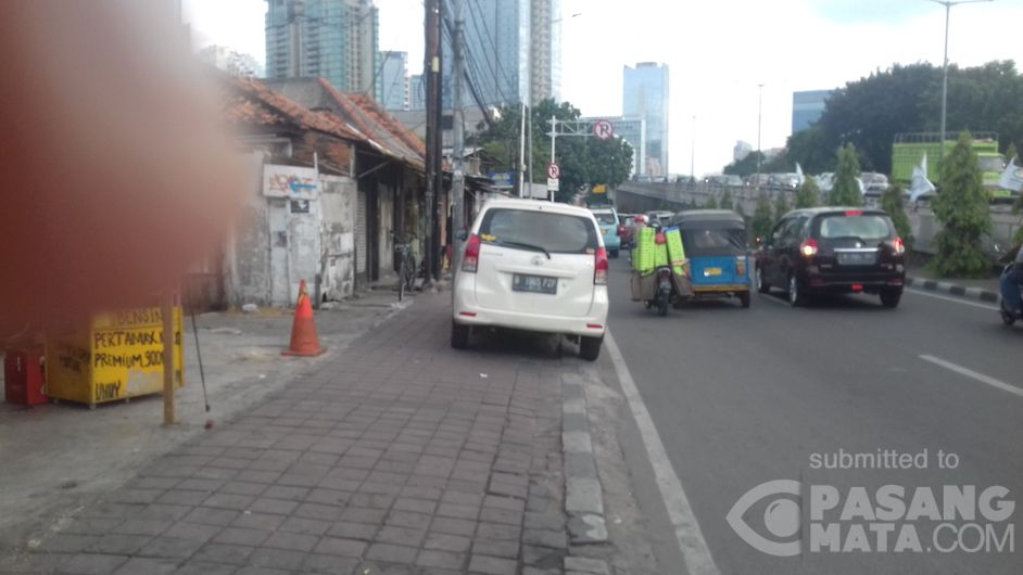 Enaknya berbuat zalim pada pajalan kaki dengan memarkir kendaraan di trotoar. Pejalan kaki monggo berjalan di badan jalan, "Semoga selamat tidak tertabrak". Lokasi di Jalan KH Mas Mansyur. #RamahTrotoar