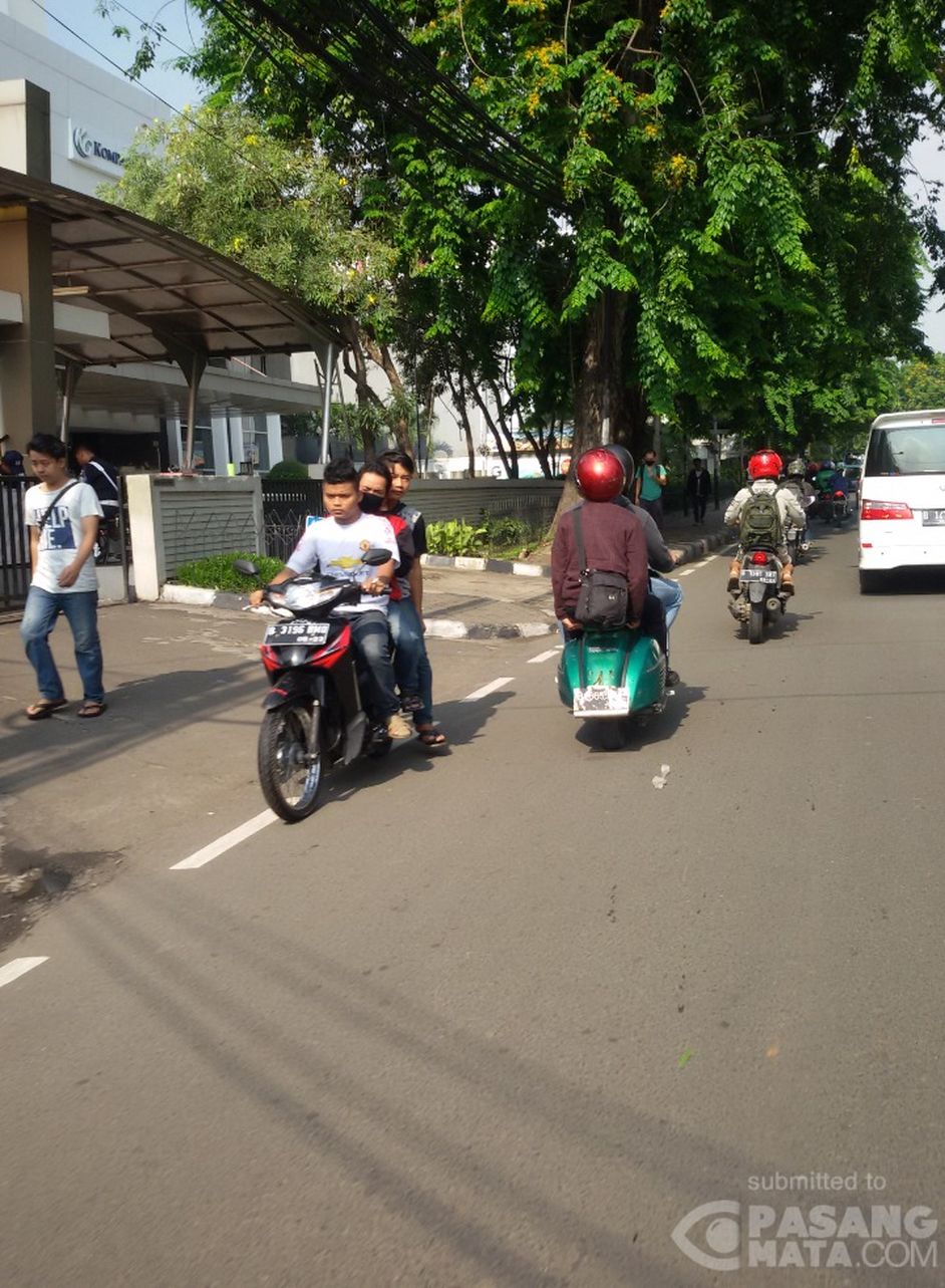 Warung pelanggaran 'Cepat Saji' tersedia dalam pilihan menu paket komplit tengah disajikan pemotor ini. Tampak mulai dari #LawanArus, berboncengan berlebih sampai berkendaraan tanpa kenakan helm tersaji apik di aksi Abang Ganteng pemotor ini. Di Jl. Palmerah Barat sekitar depan Gedung Kompas Gramedia.
