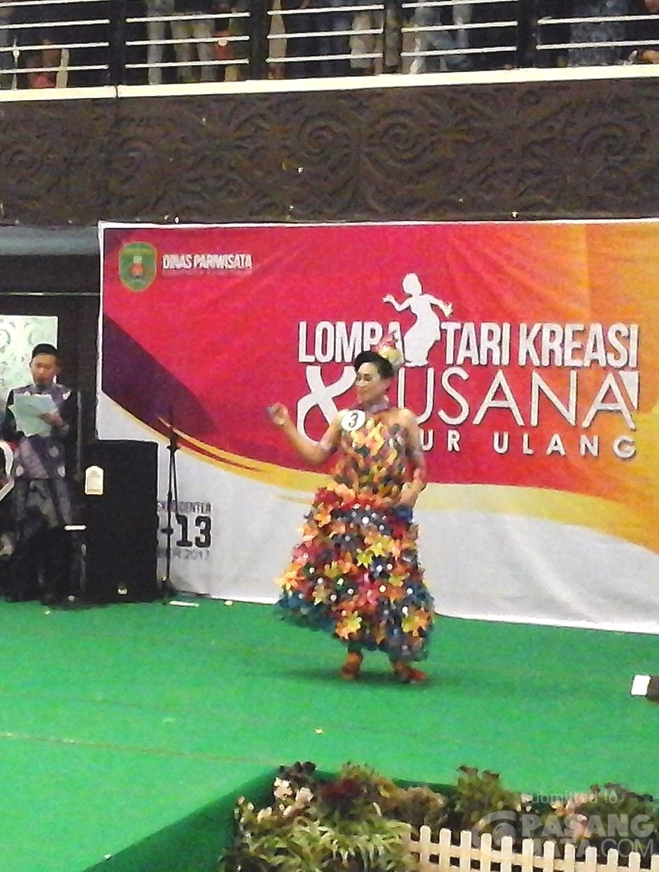 Gaun yang dikenakan model ini di buat dari bahan botol air mineral bekas. Para designer Kutim beradu apik merancang busana yang dirajut menggunakan bahan daur ulang seperti bungkus minuman sachet, bungkus permen, kain perca sampai karung bekas dan lain-lain. Agenda ini mendapat sambutan positif dari pengunjung Kutim Expo 2017 malam ini di sekeliling panggung ruang Graha Expo Center.