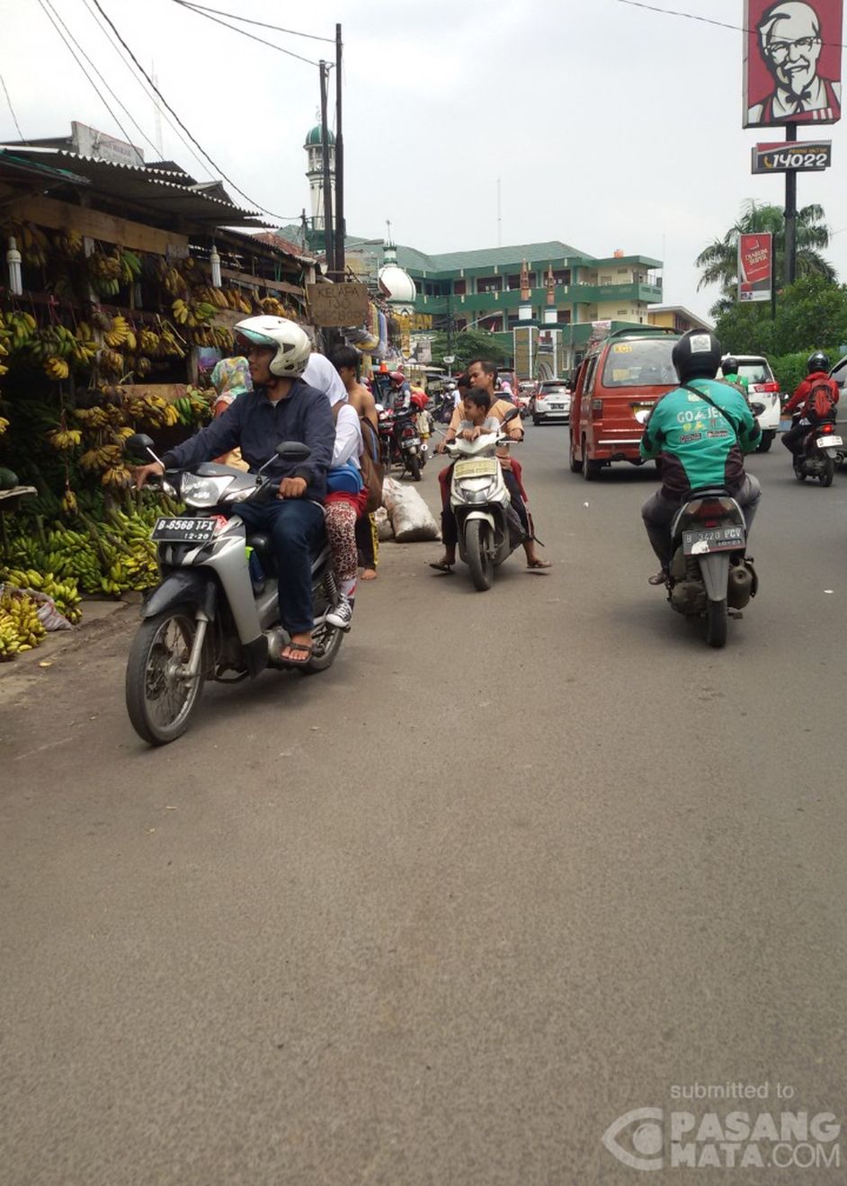 Duh, Seram! Ketika aksi #LawanArus ditemani pemandangan segar buah pisang yang menggoda. Tampaknya selain memburu jalur pintas, pisang juga menjadi target buruan kawanan pemotor ini. Di Jl. Masjid Nurul Ihsan, Plaza Pondok Gede, Bekasi.