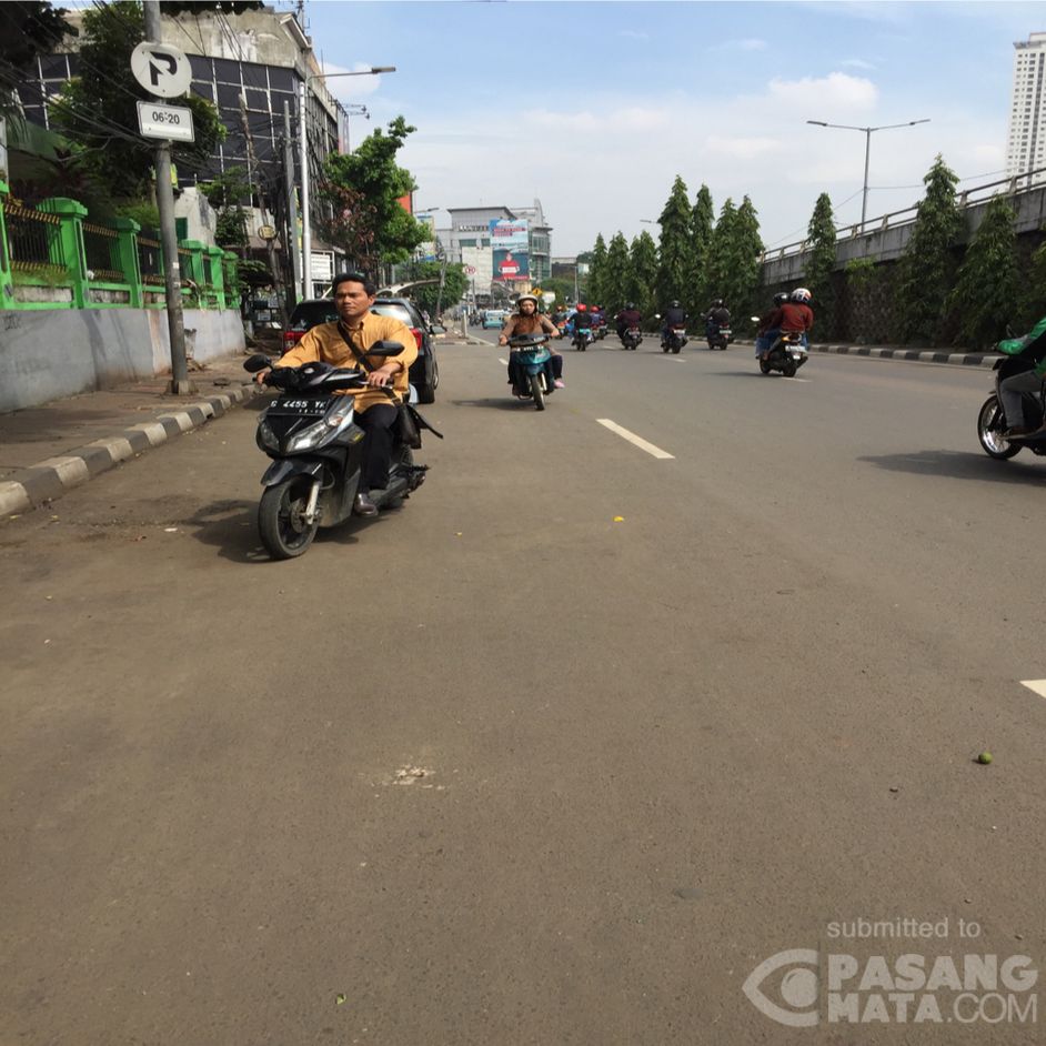 Di Jalan Kyai Haji Mas Mansyur tepatnya di depan Gedung Kementrian Agama Jakarta Pusat sering menjadi kawasan lawan arus kendaraan bermotor. Contohnya ini seorang laki-laki dan seorang perempuan yang tertangkap kamera mata-mata sedang lawan arus.
