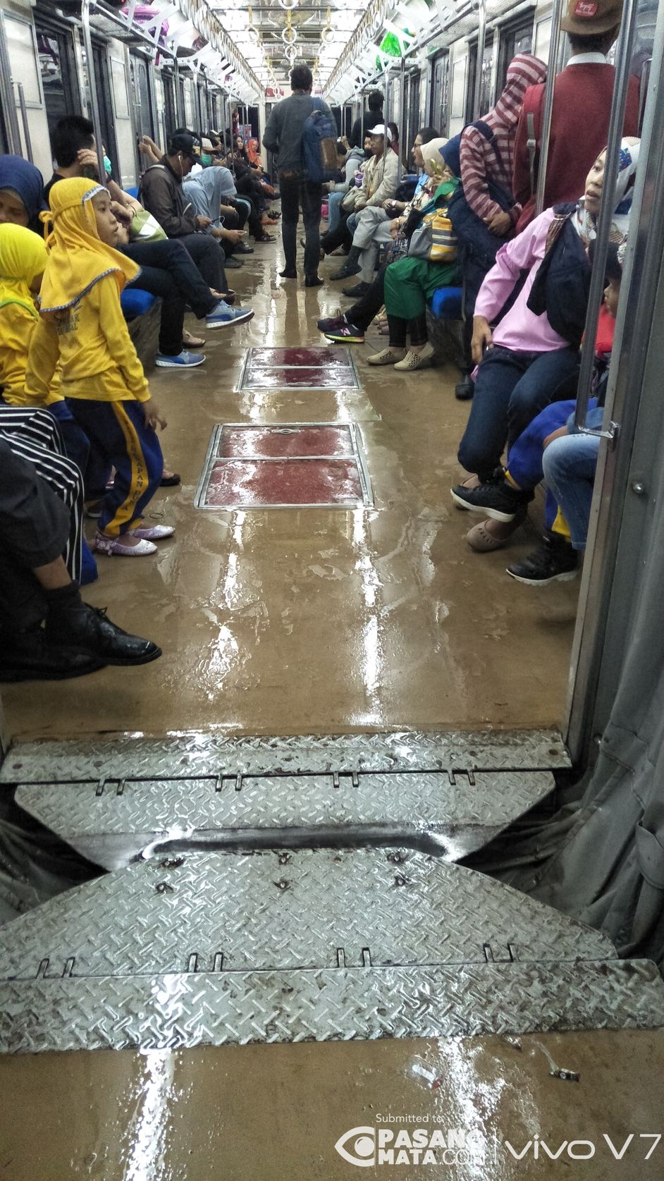 Seiring musim hujan, kontrol dan perawatanan commuter line sangat perlu. Nampak sambungan atau bordes commuter line bocor hingga air ke dalam gerbong. Lokasi di Taman Sari