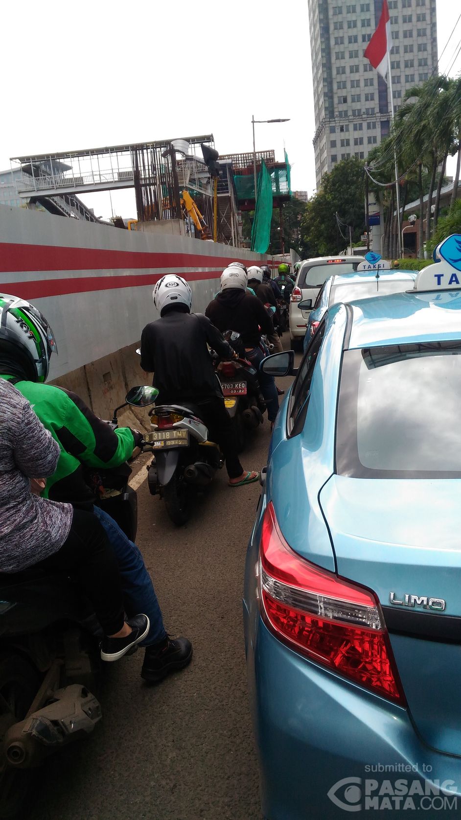 Arus lalu lintas di Jalan MT Haryono menuju stasiun Cawang Jakarta padat merayap karena penyempitan jalur pembangunan LRT