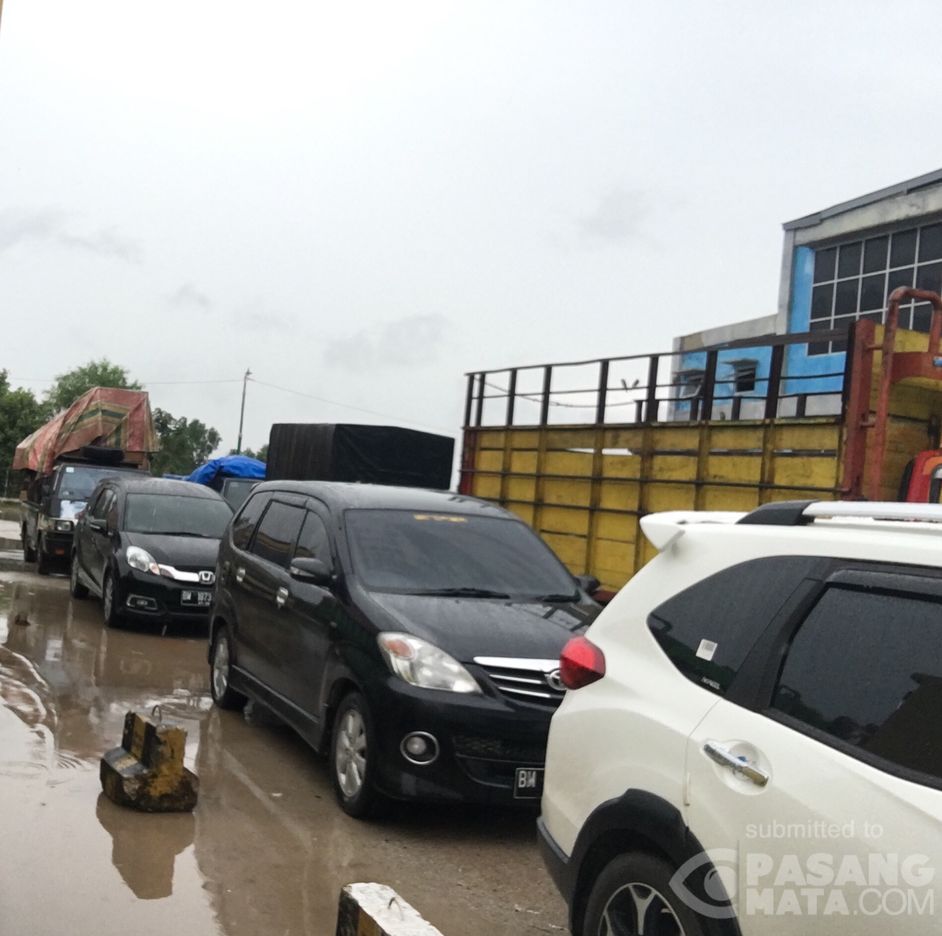 Antrian di Pelabuhan Roro Dumai siang ini dipenuhi kendaraan beroda 4 dan diwarnai hujan gerimis.