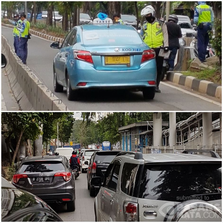 Selasa, 27.03.2018. Kemacetan total terjadi di sepanjang Jl. Teuku Nyak Arif arah Permata Hijau sore ini. Tetapi kemacetan itu tidak memberikan hak kepada pengemudi taxi dan pemotor ini untuk meluncur dan menggagahi jalur TransJakarta. Tampak Tim Penegakan Hukum Gabungan Polri dan Dishub DKI Jakarta sedang beraksi menghadang dan menilang mereka. Kapok mudah-mudahan.