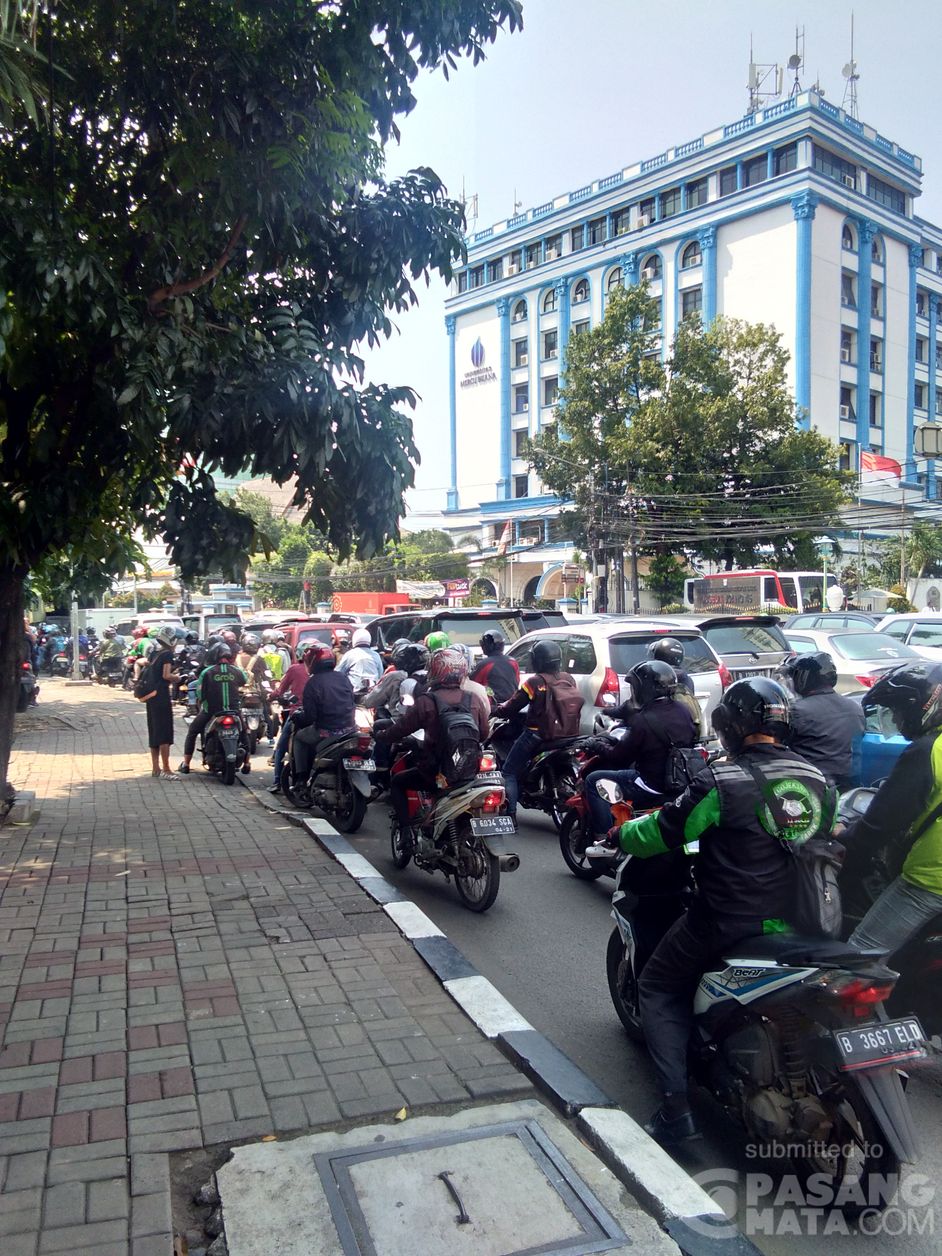 Siang ini arus lalu lintas di jalan Menteng Raya Jakarta Pusat arah Gambir macet parah.