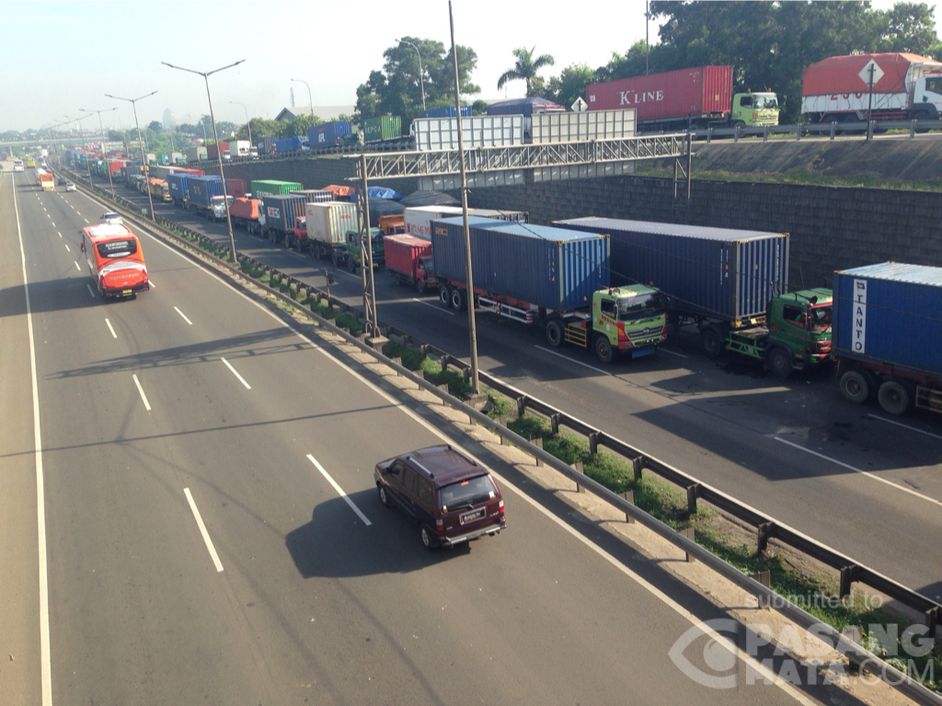 Suasana terkini lalin tol lingkar luar Bintara Bekasi arah Cikunir yang tidak bergerak sejak pukul tiga dini hari hingga saat ini, terlihat kendaraan kontainer dan truk-truk yang terlihat antre, tidak terlihat ada kendaraan pribadi, dan satu jalur terlihat kosong.