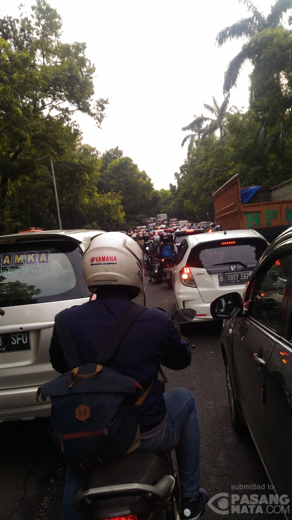 Tampak kepadatan arus lalu lintas di Jalan Margonda Depok lewat jembatan lingkar UI Depok menuju Srengseng Sawah Jakarta Selatan pagi ini