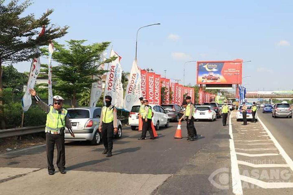Petugas satlantas Polres Karawang berlakukan buka tutup rest area 57 hindari penumpukan kendaraan sore ini