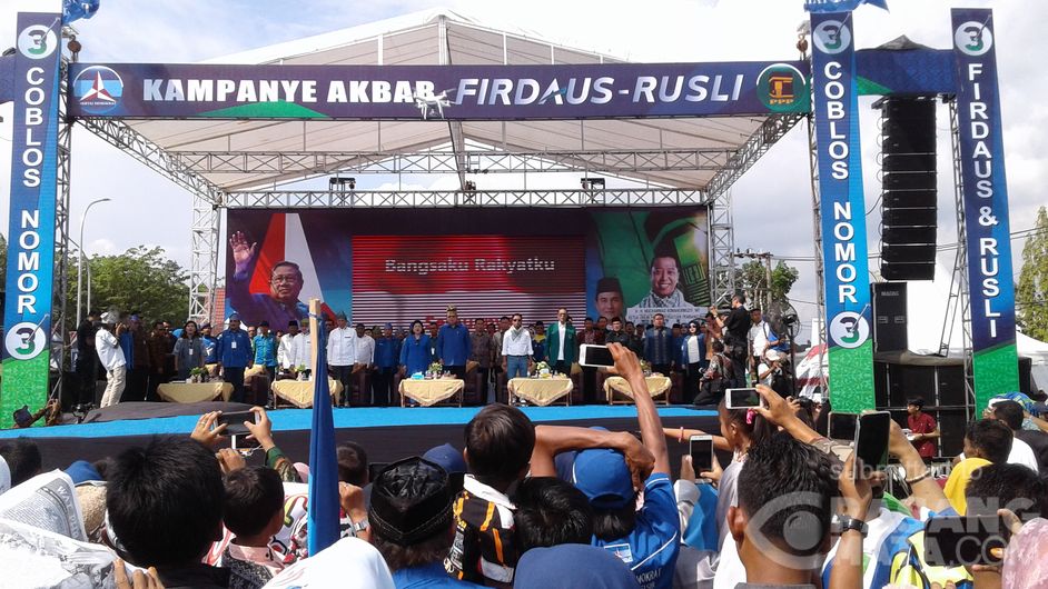 Sore ini SBY presiden RI ke-6 menghadiri kampanye pemilihan Gubernur Riau Firdaus-Rusli di lapangan Merdeka Bangkinang Kampar Riau.. Ribuan masyarakat Kampar sambut SBY.
