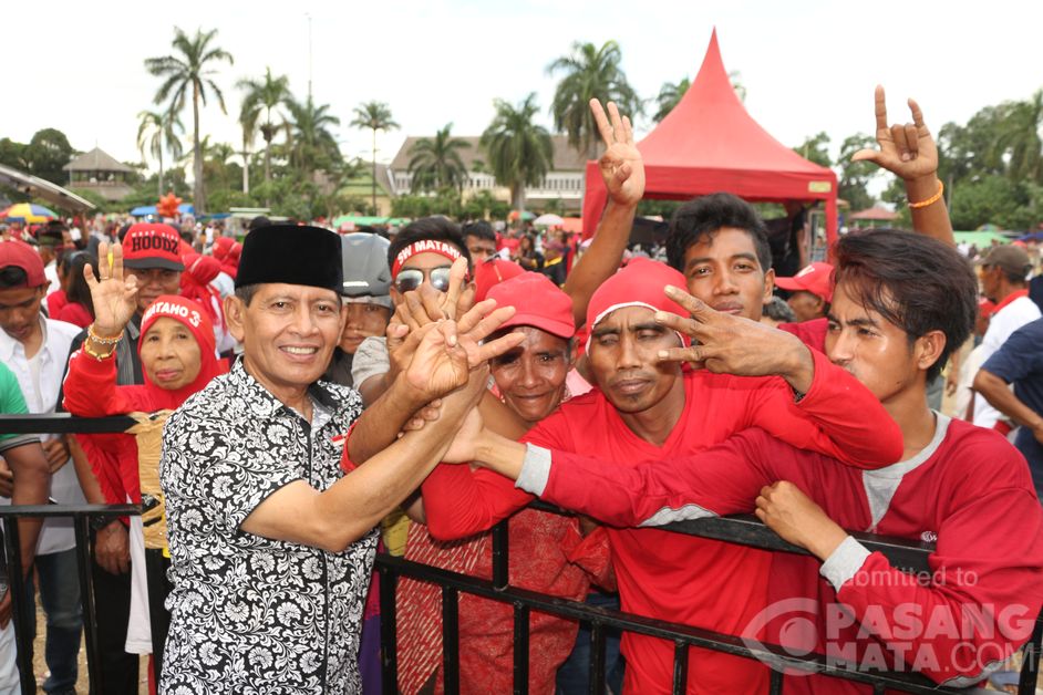 Subhan H.M.Nur S.H calon walikota Kota Bima menghampiri para pendukungnya usai menyuarakan visi misi nya dalam kampanye akbar di Lapangan Serasuba Kota Bima, kamis 21 juni 2018.