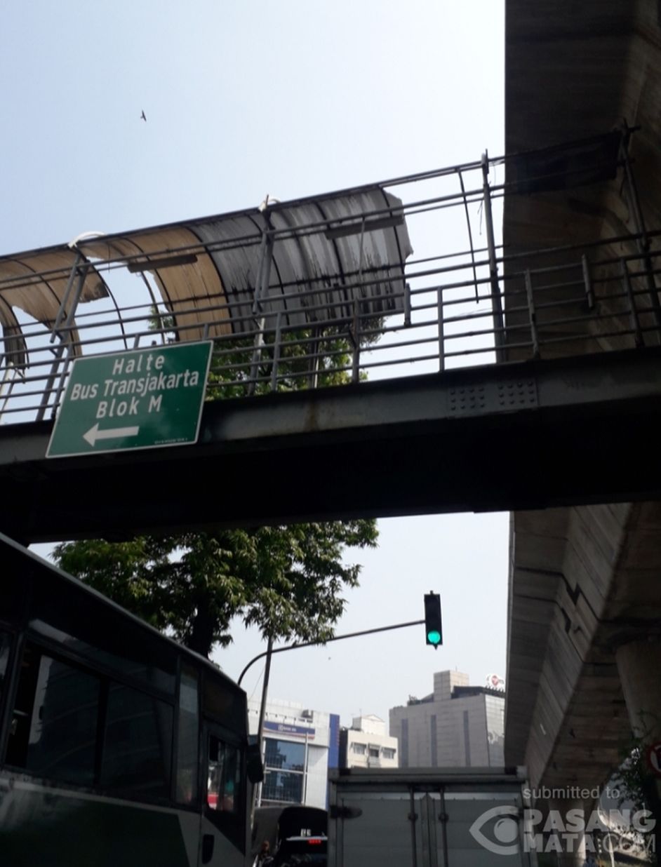Wah, Sedih! Tampak atap JPO Halte Transjakarta Blok M ini perlu sentuhan pejabat DKI Jakarta dengan segera. Jelang Asian Games 2018, atas jembatan penyebrangan orang harus segera diperbaiki. Di Jl. Iskandarsyah Raya, Blok M.