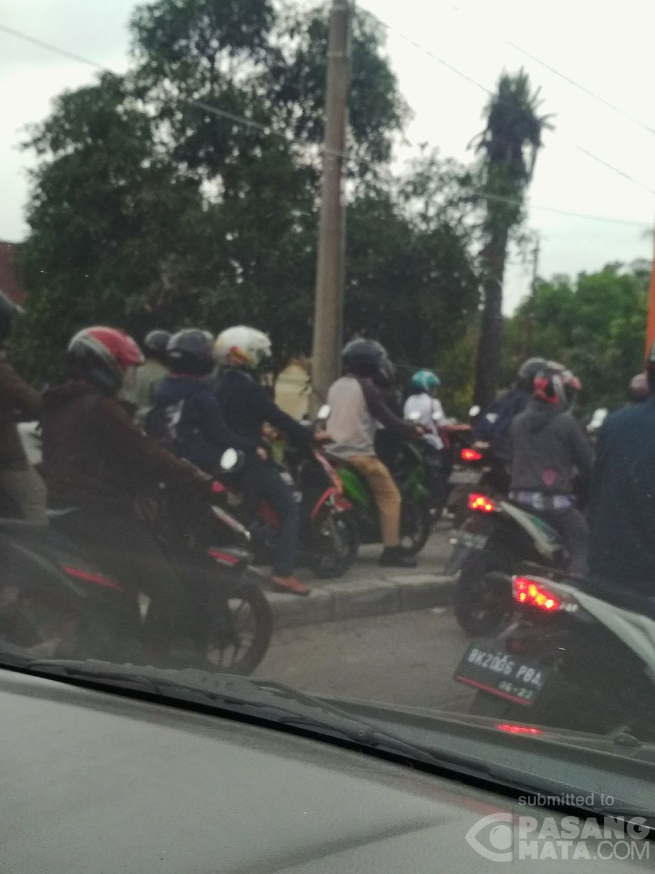 Beralih fungsi menjadi lajur kendaraan motor, trotoar yang ada di Jalan Binjai Km 11 dipenuhi oleh kendaraan bermotor yang melintas.