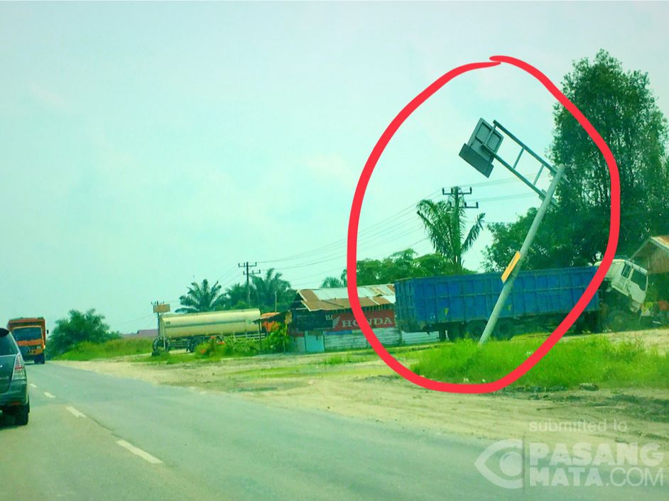Tak diperhatikan, rambu ini tampak miring terabaikan. Seperti tak berfungsi rambu yang berada di kulim ini butuh perhatian. Lokasi di Jalan Lintas Sumatera - Riau, Kulim, Km 17, Riau.