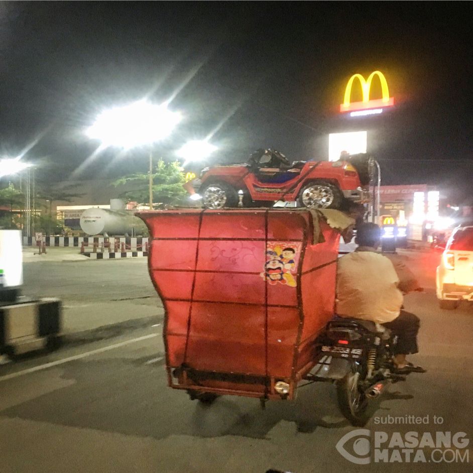Awas malam ini tampak ada mobil naik becak melintas di Jalan Soekarno Hatta, tepat berada di depan SPBU Tanah Tinggi saat foto diambil. Seperti berikut penampakannya. Pengendara dengan angkutan seperti ini dapat bahayakan keselamatan pengendara lain.