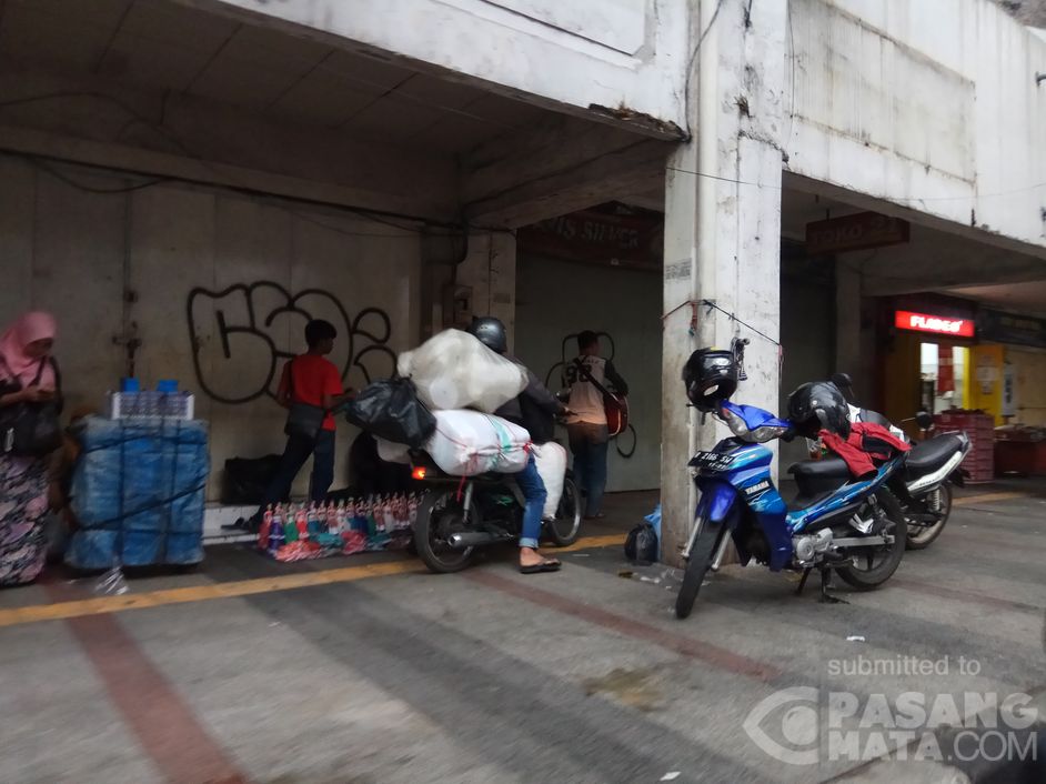 Sudah kelebihan muatan, pengendara motor ini juga memakai trotoar untuk jalan pintas di Jalan Otista Bandung
