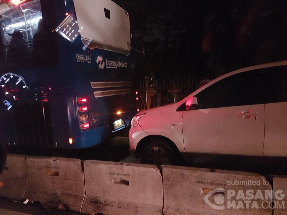 Jalan relatif sepi, tetapi pemobil ini seakan tidak sabar sampai di tujuannya sehingga memutuskan untuk menggagahi jalur bus Transjakarta di Jl. Letjen Soepono menjelang terminal Permata Hijau arah Joglo. Terpantau mobil tersebut seakan-akan sedang bergandengan dengan bus Transjakarta