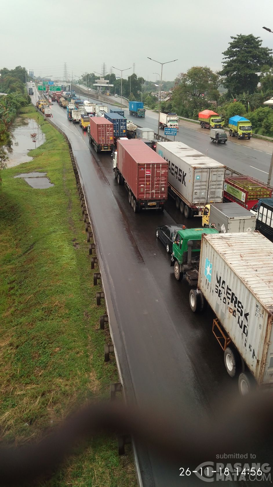Lalu lintas tol lingkar luar timur Bintara Bekasi arah Cikunir terpantau padat merayap sore hari ini.