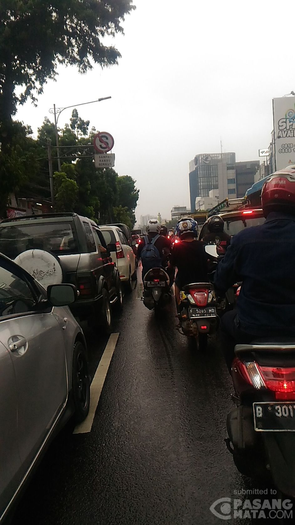 Kelakuan pengendara bila berada di lampu merah. Maju ke depan lewati batas garis agar bisa jalan duluan. Padahal sangat membahayakan. Lokasi lampu merah Kalibata - Pasar Minggu.