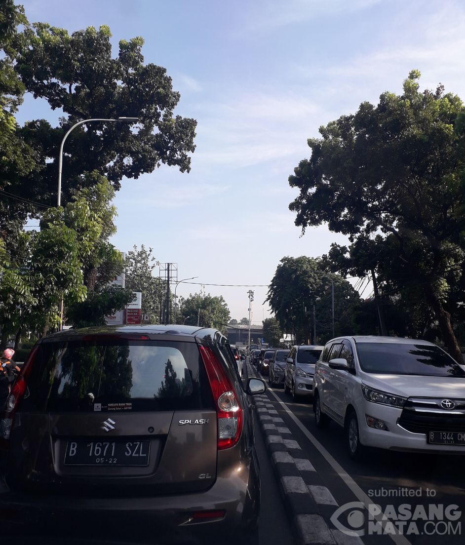 Kondisi arus lalu lintas pagi ini di jalan Raya Pasar Minggu ruas TL Tugu Pancoran padat merayap di kedua ruas arah.