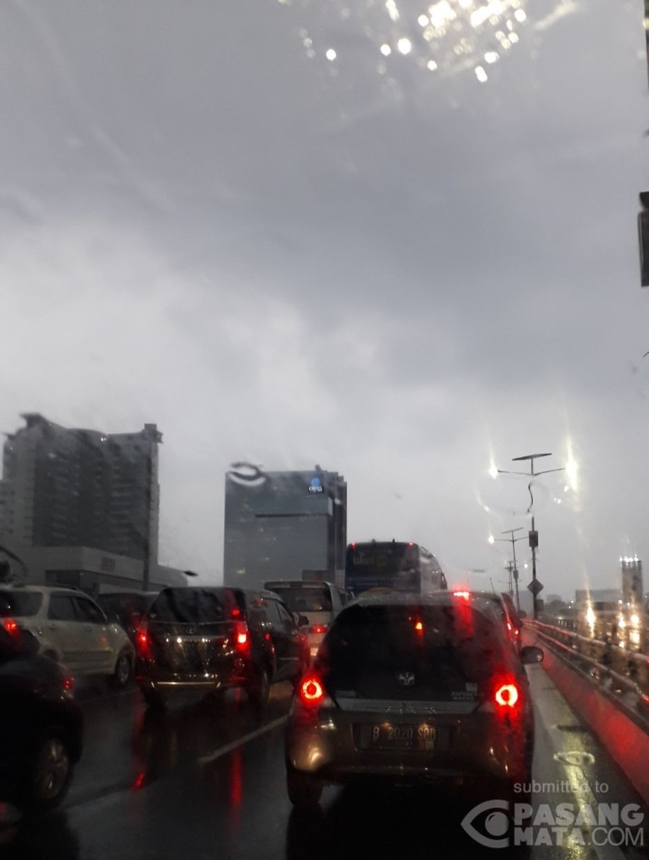 Sore ini kondisi arus lalu lintas di Tol Dalam Kota Km. 11 ruas Palmerah arah Pancoran tampak padat merayap. Cuaca hujan deras