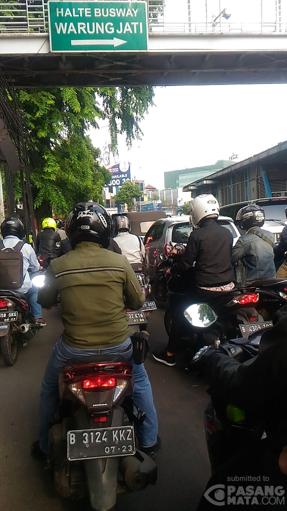 Tampak kepadatan arus lalu lintas di jalan Warung Jati Barat menuju Mampang Prapatan Jakarta Selatan.