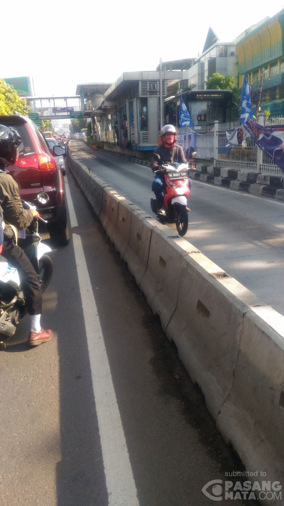 Karena sudah terlanjur masuk jalur Transjakarta, ternyata di ujung ada polisi yang berjaga. Seorang pengendara motor ini nekat balik arah melawan arus di Mampang Prapatan Jakarta Selatan.