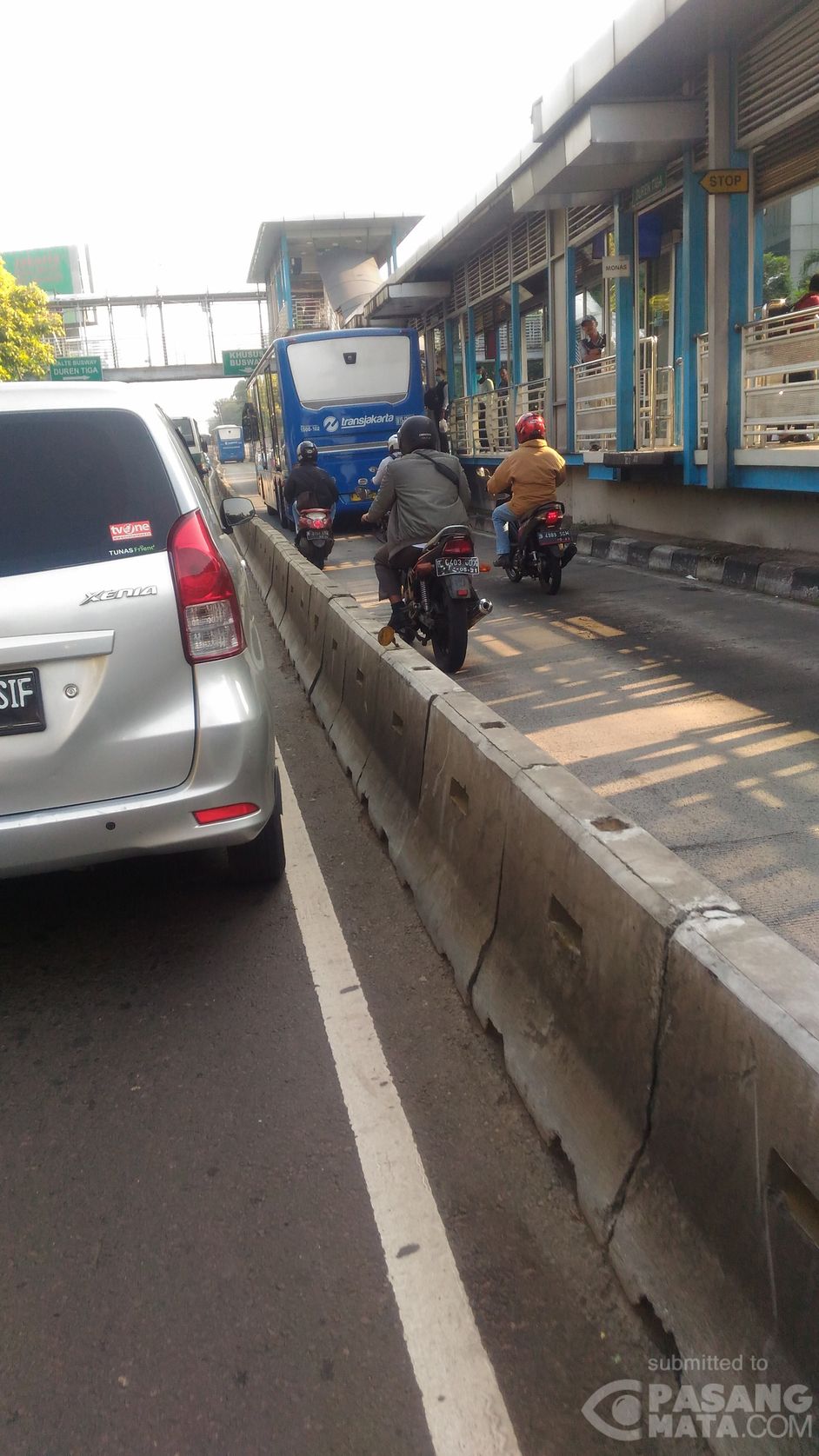 Para pengendara motor ini nekat mencari jalan pintas menghindari macet dengan masuk jalur transjakarta di Mampang Prapatan, Jakarta Selatan.