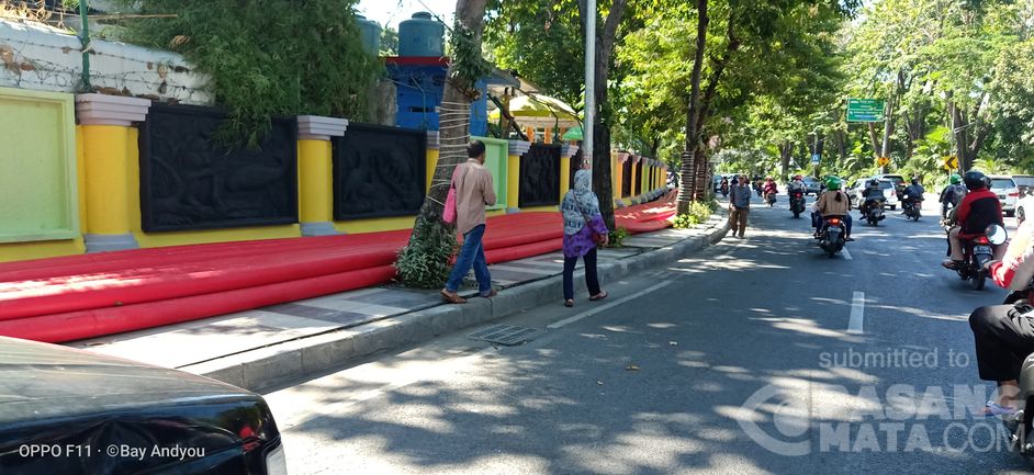 Ngawur, jalur pejalan kaki yang telah dipercantik di samping Kebun Binatang Surabaya ini hanya untuk peletakan material proyek. Pejalan kaki pun mengalah untuk berjalan di jalur kendaraan meski dapat membahayakan keselamatannya, Sabtu (20/7) siang.