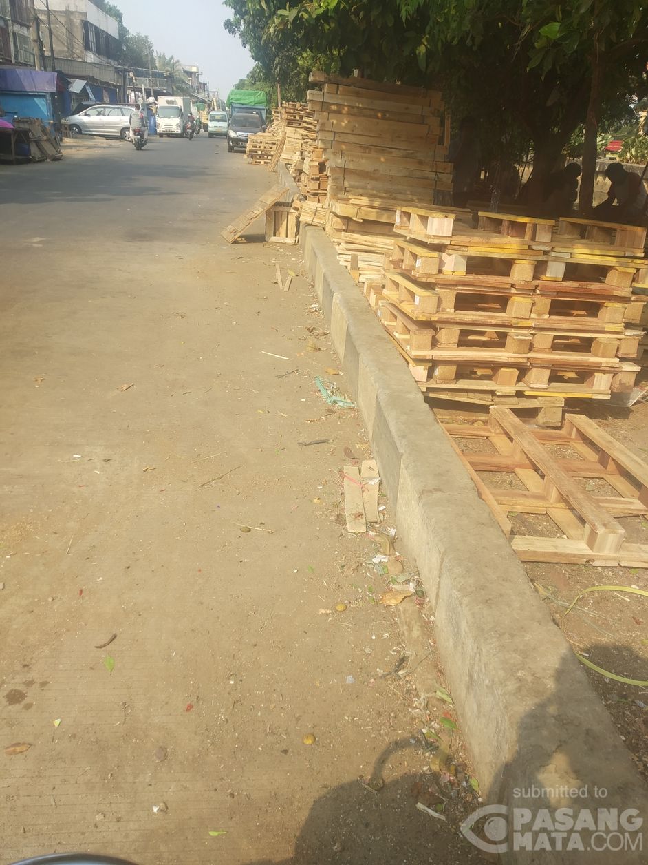 Bahu jalan trotoar di wilayah Kecamatan Penjaringan beralih fungsi menjadi tempat penumpukan kayu. Akses untuk pejalan kaki jadi terhambat karena adanya tumpukan kayu di trotoar itu.