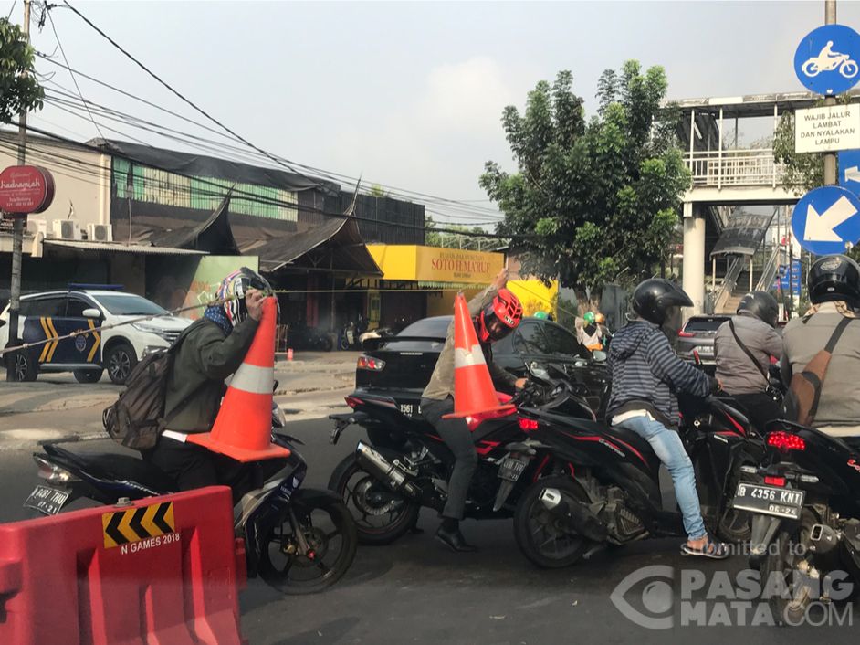 Pelanggar lalu lintas tidak mengenal peraturan. Sudah ada pembatas cone sebagai pembatas jalan, pemotor di Pramuka nekat melanggar dengan cara mengangkat cone tersebut untuk memotong jalan.