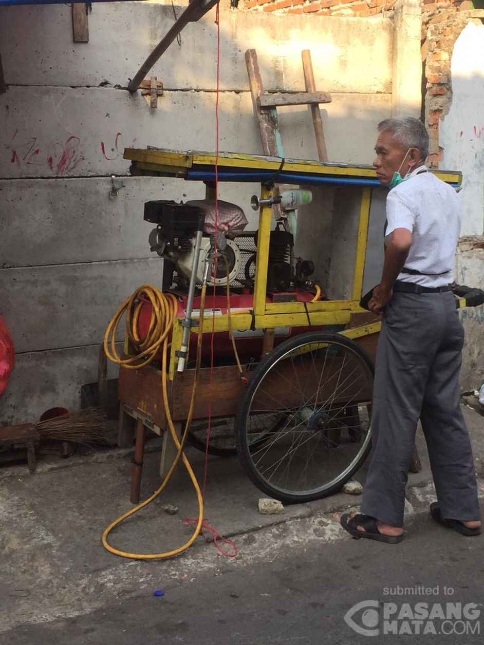 Perawakan rapi dari seorang tukang tambal ban dengan celana bahan abu-abu dan kemeja putih. Juga kreatif menggunakan bahan daur ulang handbody yang dijadikan sebagai klakson di gerobak tambal ban kelilingnya. Di usianya masih semangat bekerja ditambah pakaian rapi. Lokasi di Belakang parkiran Kota Kasablanka