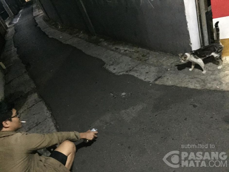 Terlihat tiap malam, pria muda ini selalu memberi makan kucing-kucing liar yang kelaparan. Padahal, ia tidak punya kucing yang dipelihara namun selalu membeli makanan kucing yang diwadahi tempat minum untuk memudahkan dibawa saat berjalan malam-malam dan memberikannya kepada kucing liar. Sungguh jarang masih ada pria muda seperti ini yang masih memiliki misi mulia. Lokasi di Al Barkah, Manggarai.