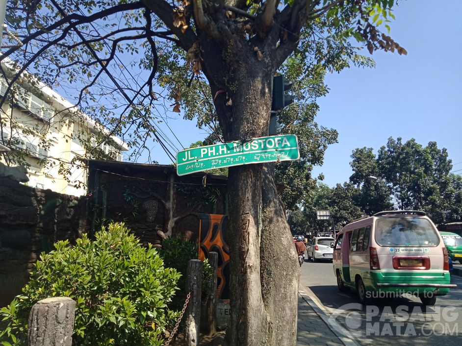 Di kawasan ini, plang nama Jalan PHH Mustofa kota Bandung sudah lama sekali hanya terpasang di atas Pohon yang sudah kering, entah kenapa tiang besi ini hilang? Padahal arah jalur ini termasuk jalan utama paling padat ketika pagi dan sore, pertemuam arah timur ke barat semoga saja dinas terkait bisa segera meremajakannya, tiang nama jalan PHH Mustofa supaya rapi dan enak diliat.