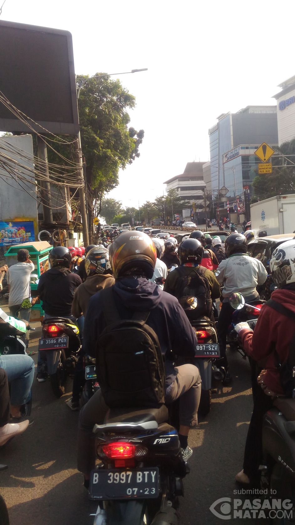 Arus lalu lintas di Jalan Warung Jati Timur menuju Mampang Prapatan Jakarta Selatan tampak padat merayap.