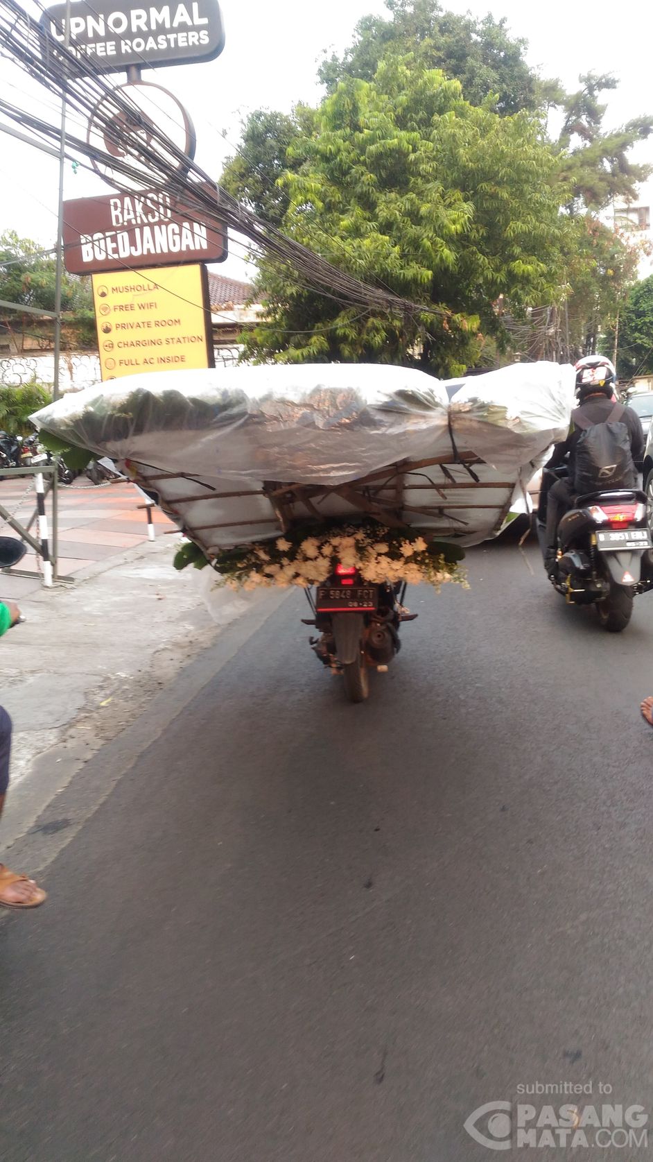 Seorang pengendara motor nekat membawa karangan bunga di motornya ini bisa membahayakan diri sendiri maupun orang lain di Jalan Kemang Raya Jakarta Selatan.