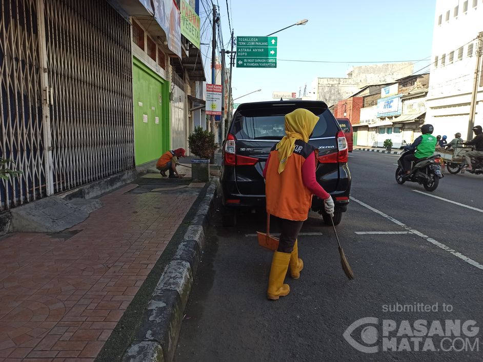 Petugas kebersihan di Jalan Otista Bandung ini tetap setia mengerjakan tugasnya di tengah pandemi Covid-19 untuk kebersihan Kota Bandung