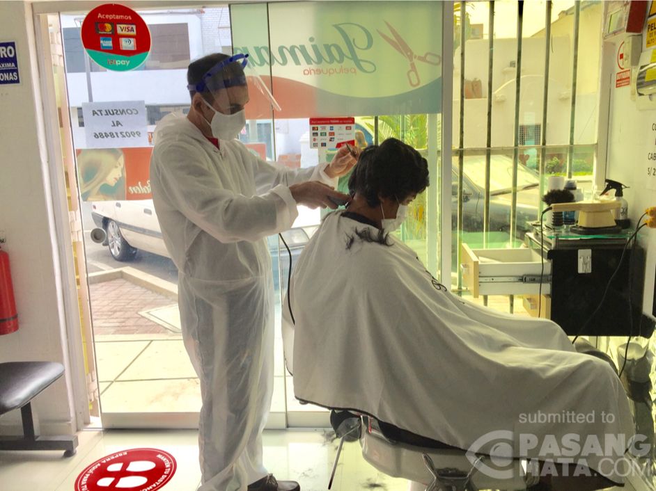 Beginilah kondisi new normal di sebuah gerai cukur di kota Lima, Peru. Tukang cukurnya mengenakan baju APD, faceshield dan masker sementara yang dicukur tetap memakai maskernya. Protokol kesehatan pencegahan penyebaran Covid-19 harus dipatuhi jika tidak maka gerai cukurnya tidak boleh buka melayani customer