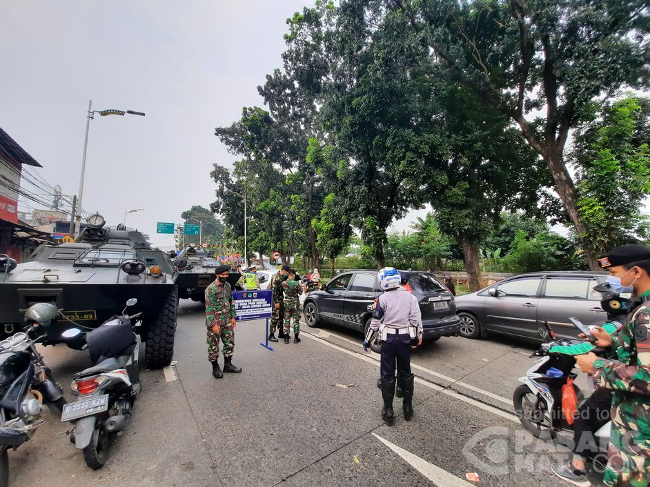 Jakarta (5/7), Hingga pukul 17.00 WIB, aparat gabungan masih bersiaga membatasi pengendara yang ingin menuju Jakarta di Jalan Lenteng Agung Raya. Pembatasan ini sebagai upaya mendukung PPKM Darurat yang telah diberlakukan sejak 3 Juli lalu.