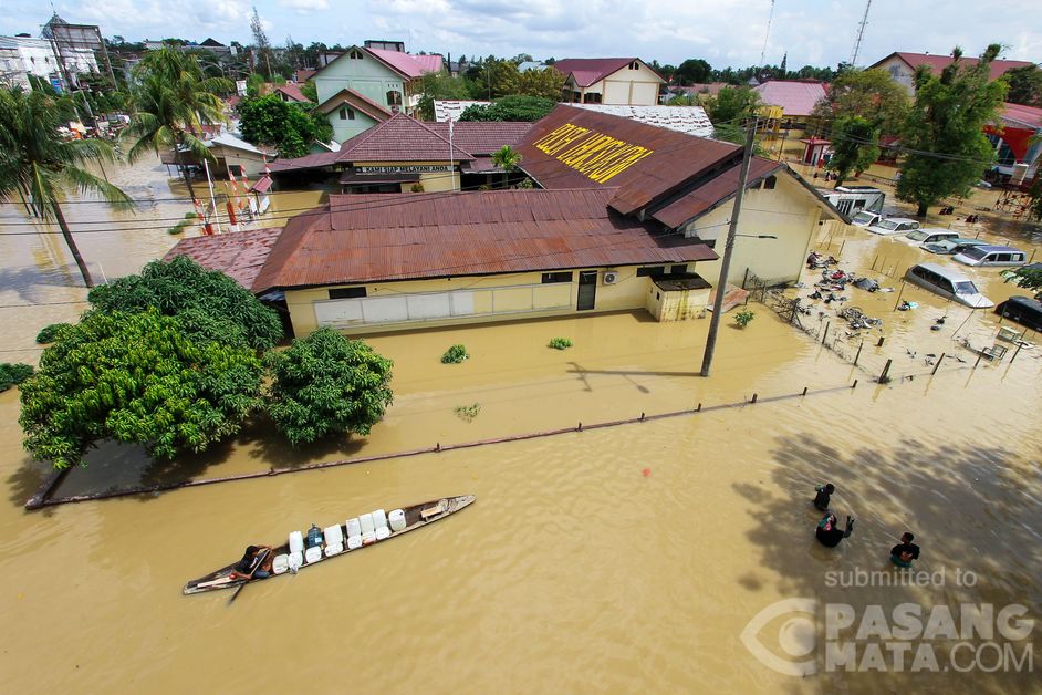 Lhoksukon, Aceh Utara - Sejumlah warga mengarungi genangan air banjir dengan perahu di samping Kapolsek Lhoksukon yang juga ikut terendam banjir akibat meluapnya air sungai, Aceh Utara pada selasa, 04 Januari 2022. Menurut data BPBD Aceh Utara jumlah pengungsi saat ini mencapai 26.482 jiwa tersebar di sejumlah Kecamatan yang ada di Kabupaten Aceh Utara.