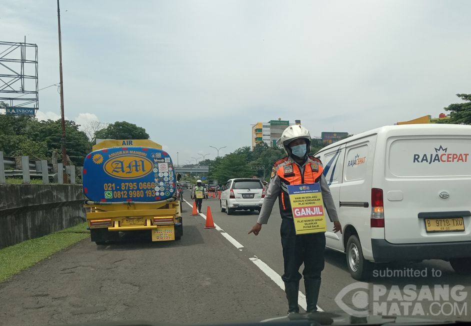 Tampak penyekatan ganjil genap selepas GTO Bogor arah Baranangsiang, Bogor, Jawa Barat. Kegiatan tersebut dilakukan guna pencegahan penyebaran virus covid.