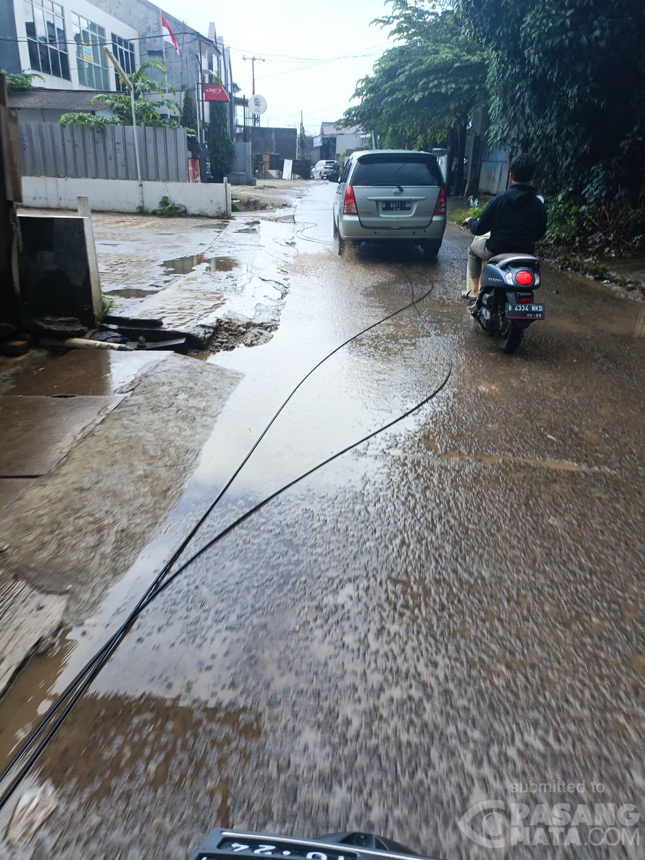 Kabel tergeletak di tengah jalan lepas dari tiangnya di Cilenggang, Tangerang Selatan. Tidak diketahui apakah terdapat tegangan listrik atau tidak, tetapi tetap membahayakan bagi warga yang melintas