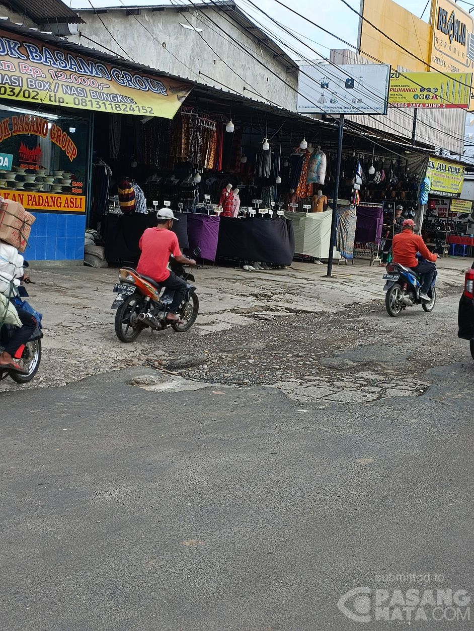 Jalan berlubang di Pondok Petir. Jalan sangat membahayakan baik bagi motor maupun mobil karena lubang sangat dalam