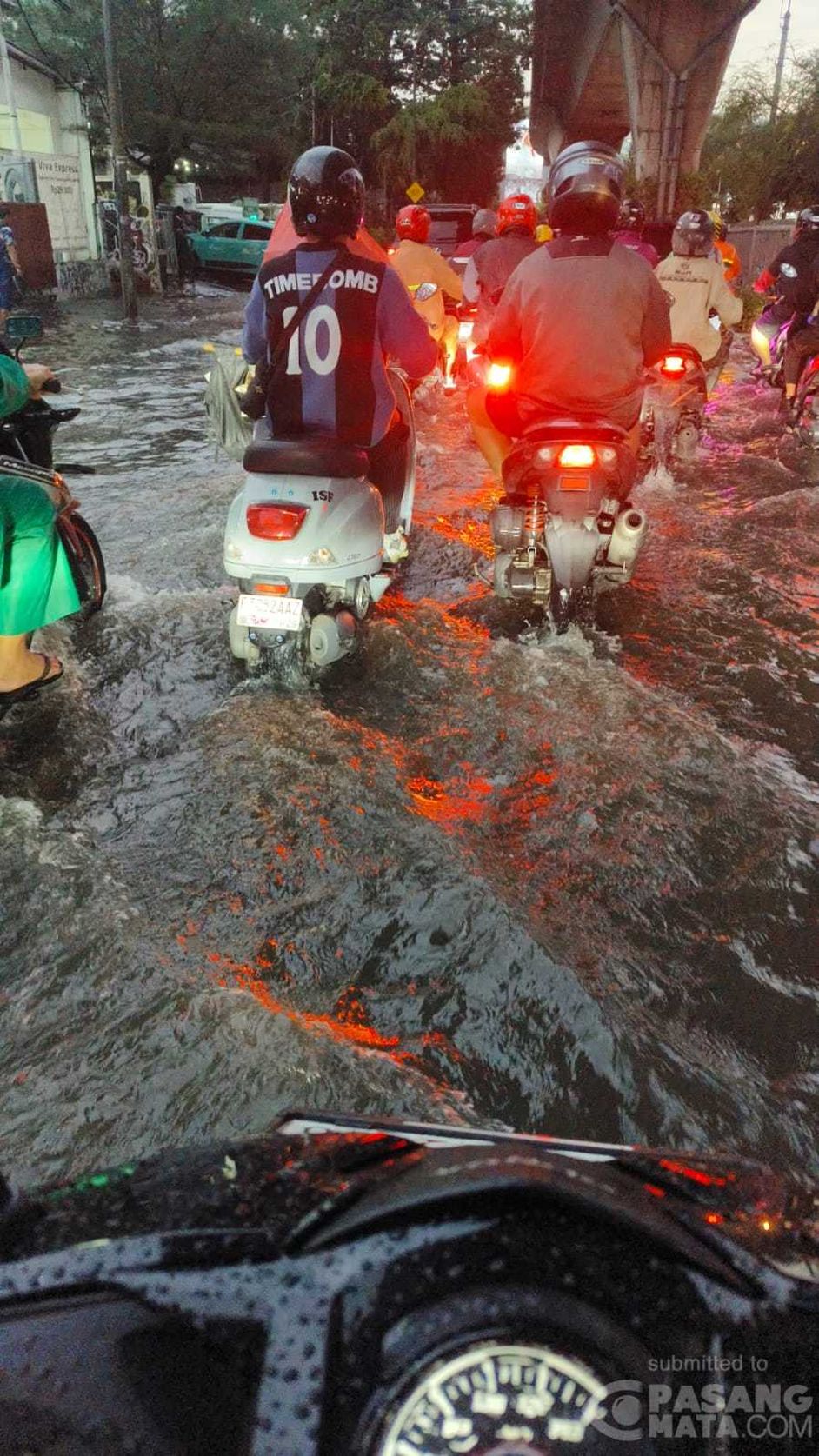 Penampakan banjir di jalan Antsari usai diguyur hujan lebat. Pemotorpun nekat menerobos banjir.