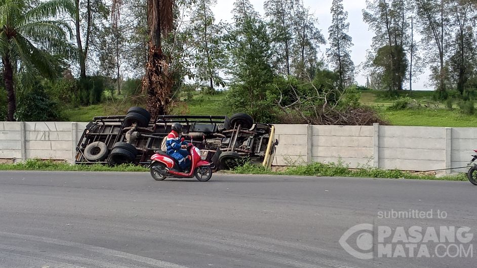 warga menggunakan sepeda motor melewati sebuah mobil yang terjungkal ke dalam sebuah parit besar di Kecamatan Muara Satu Kota Lhokseumawe, tepat nya di depan jalan menuju pintu masuk dermaga pelabuhan Krueng Geukueh Aceh Utara. Selasa, 14 april 2026, dalam laka tunggal sopir truk selamat dari maut. (Fauzan pewarta)