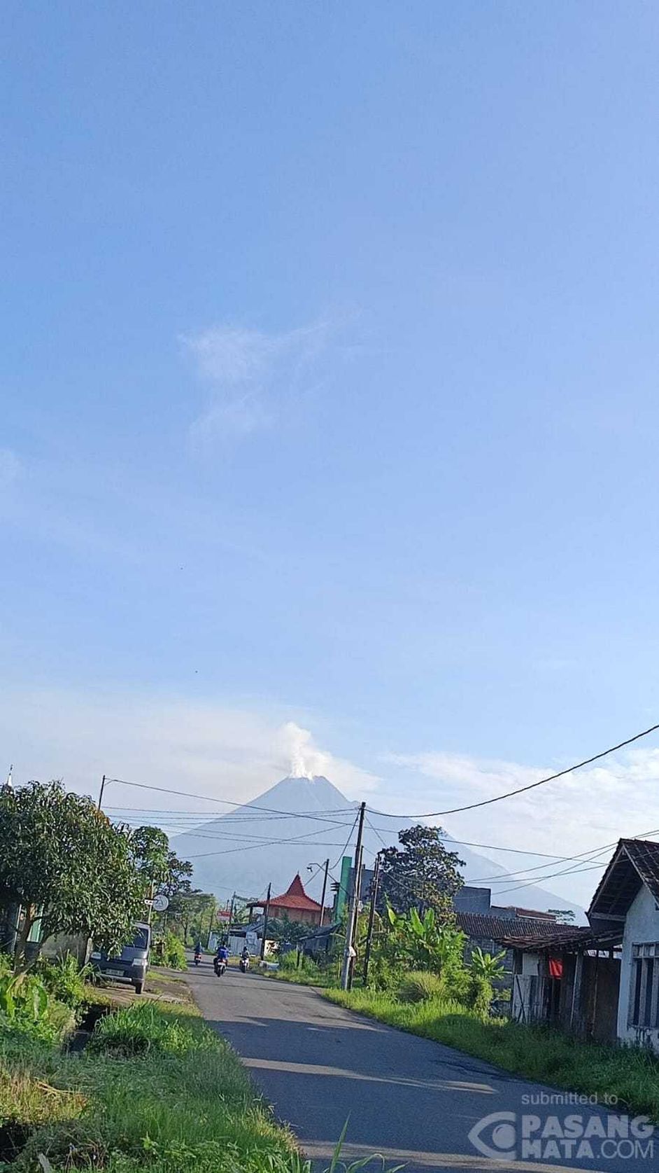 Gunung Merapi di Sleman, DIY terlihat mengeluarkan asap cukup tebal dan guguran lava. Kondisi tersebut terlihat dari Wedomartani, Ngemplak, Sleman Sabtu 11 April 2026.