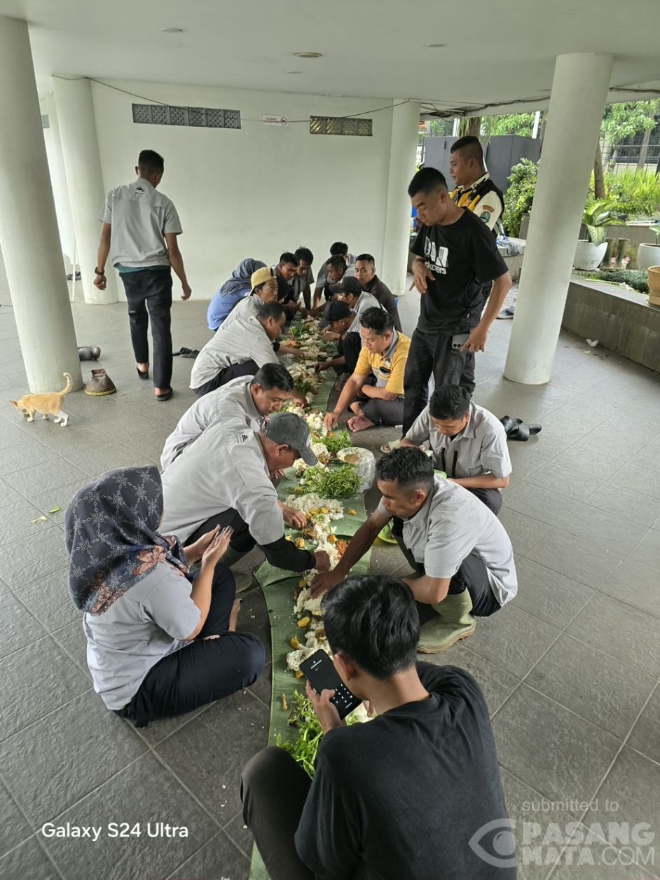 Para perawat Lapangan Gasibu Bandung sedang menikmati istirahat dan makan siang hari ini. Hidangan makan siang yang terpantau sederhana itu tersaji rapi diatas daun pisang dan disantap secara bersama. Selain menciptakan suasana guyub, makan bersama ini juga dimaksudkan untuk membangun dan memperkokoh kerjasama tim. Bravo!